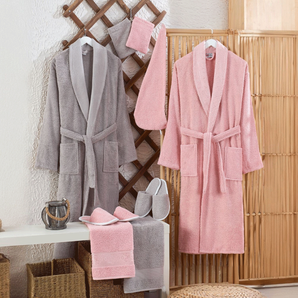 استمتعي بتجربة فندقية في منزلك مع طقم روب الحمام التركي الفاخر. مصنوع من قطن 100% طبيعي بلمسة ناعمة ووبر ثقيل يساعد على امتصاص الماء بسرعة ويمنحك راحة دافئة بعد الاستحمام. تصميمه العصري مع الزخارف الأنيقة يضيف لمسة فخامة إلى حمامك.